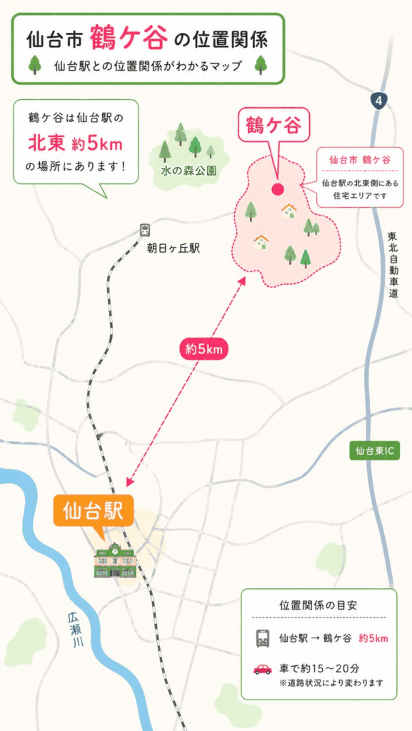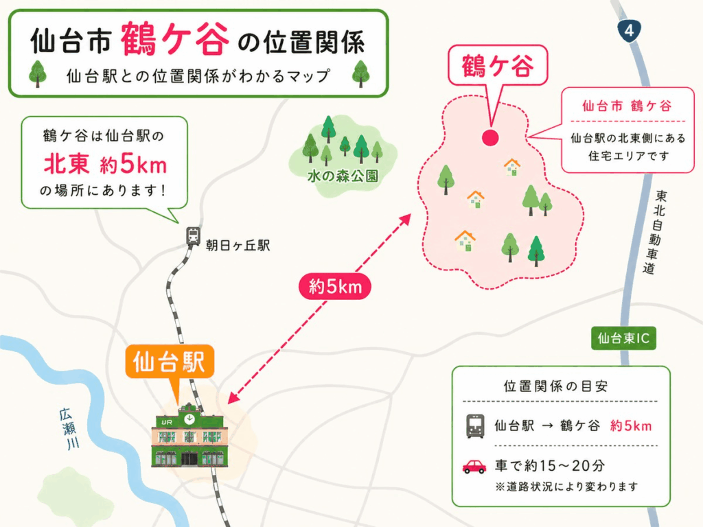 - 国道4号:鶴ケ谷の南西側を走る東北の大動脈。仙台市内・大崎方面どちらからもアクセス可