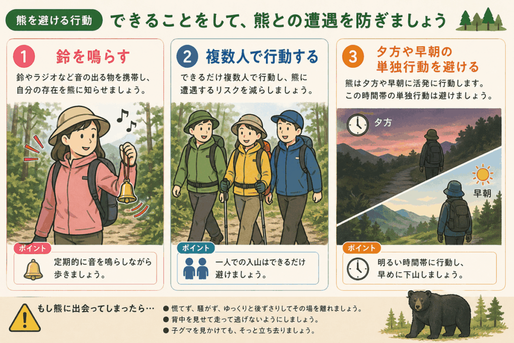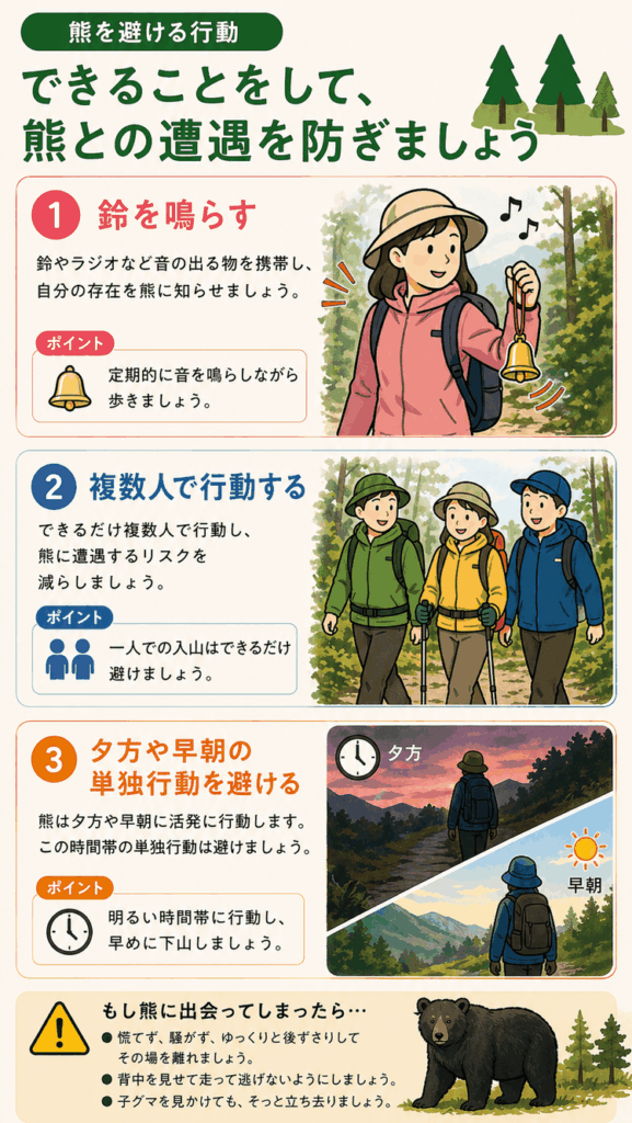 仙台市内で熊の出没が相次いでおり、今回の鶴ケ谷北の2頭はまだ発見されていません。お近くを通る方や、お子さんと一緒に外出される方は、鈴を鳴らす・複数人で行動する・夕方や早朝の単独行動を避ける など、十分にお気をつけてください。
