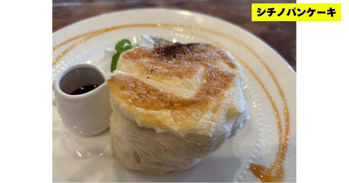 今回食べたメニューはシチノパンケーキです。パンケーキ系のメニューは何種類かはありましたが、シチノカフェにちなんでシチノパンケーキにしました。